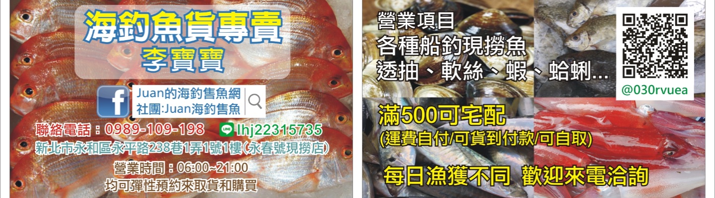 「簡介:我們專營:船釣海鮮、優選海箱網海鮮、進口特選高品質海鮮!全部都專業處理,有優質的海水冰魚技術、專業殺魚、專業真空、鮮凍櫃等設備、確保衛生乾淨!魚獲達到鎖鮮可生食等級!純良心事業,有四大保證:1.魚獲確保不上色;2.確保不上藥;3.確保新鮮度優;4.有固定銷售點,確保客戶可以隨時找得到賣家。5.宅配服務誠信,確保客戶付款收得到貨物。」