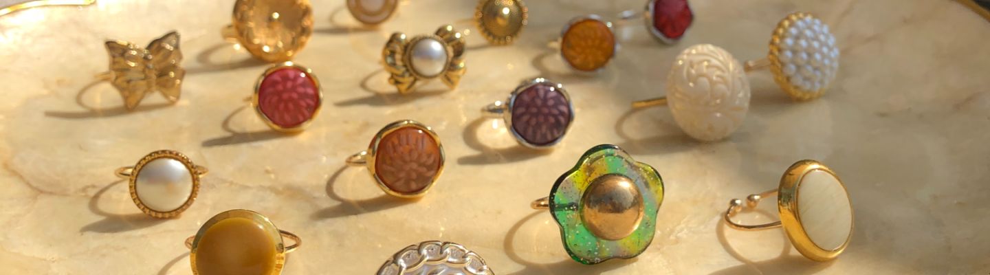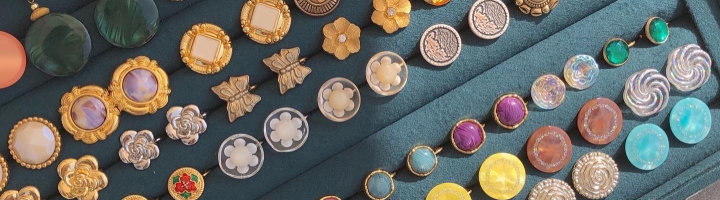 以古董鈕釦和早期老件為主體,手工精心製成耳環、戒指、保羅領帶等飾品,予舊物注入新的姿態與美的意涵。