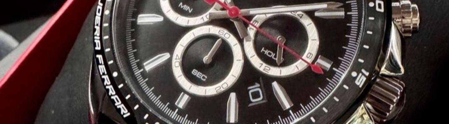 FERRARI手錶,編號FE00084,46mm銀圓形精鋼錶殼,黑色三眼, 中三針顯示, 運動錶面,深黑色真皮皮革錶帶款