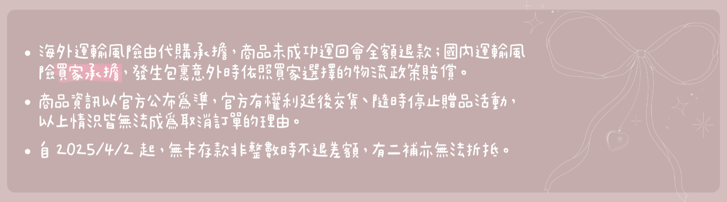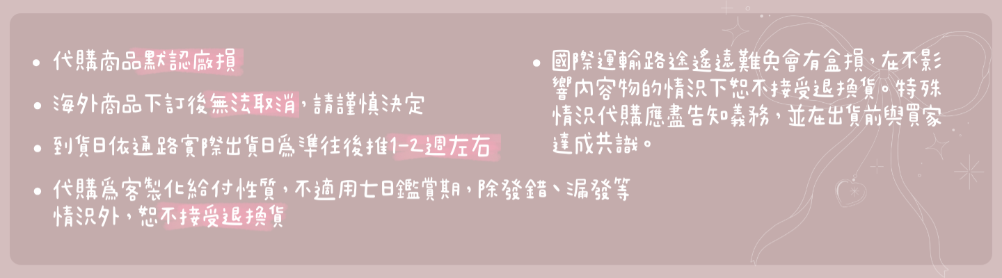 - 若商品因海關抽查拆封,外包裝可能無法復原(包含隨機卡等盲盒項目,如果沒有餘量,仍會正常出貨)