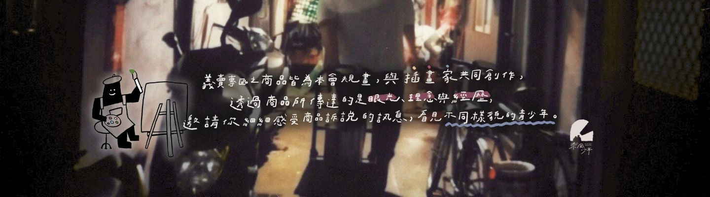 這間義賣所裡的每一個義賣品,皆為乘風少年原創發想,並與插畫師合作共同設計完成,它們代表著支持乘風一直以來的組織信念——「陪著風暴中的你淋雨,一起成為嚮往的大人。」