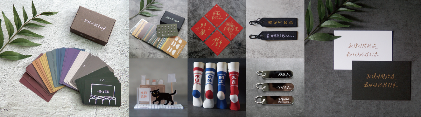 另有一條從生活中長出的支線,例如「本日公休」「開工大吉」組合襪,與「看見什麼吃什麼」牌卡,