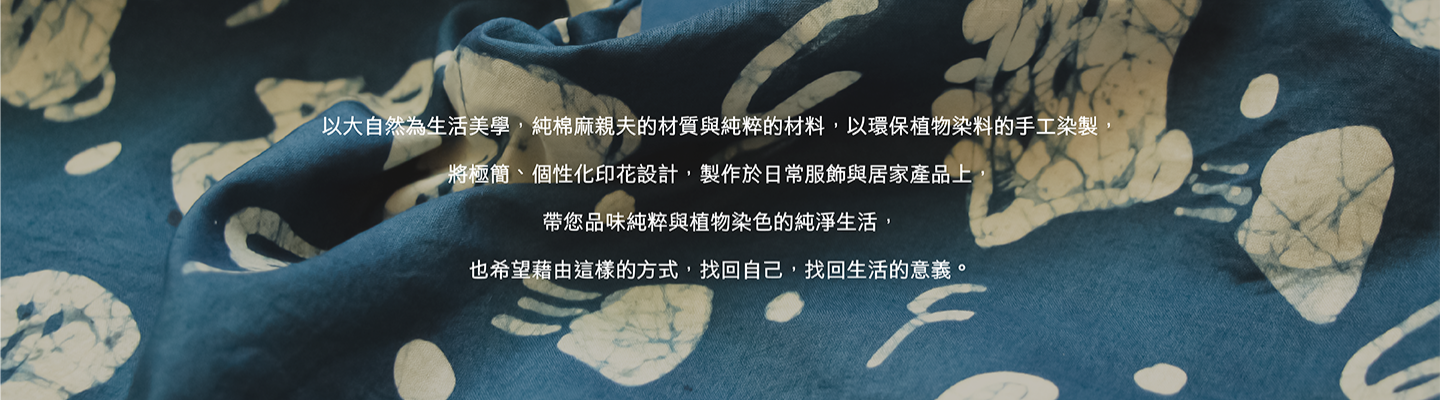 我們以大自然為生活美學,純棉麻親膚的材質與純粹的材料,以環保植物染料的手工染製,將極簡、個性化印花設計,製作於日常服飾與居家產品上,帶您品味純粹與植物染色的純淨生活,也希望藉由這樣的方式,找回自己,找回生活。