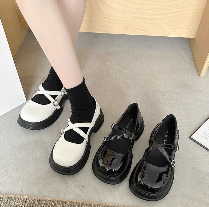 日系復古文青風 質感漆皮 圓頭包鞋 交叉細帶 厚底鞋 瑪莉珍鞋 娃娃鞋
